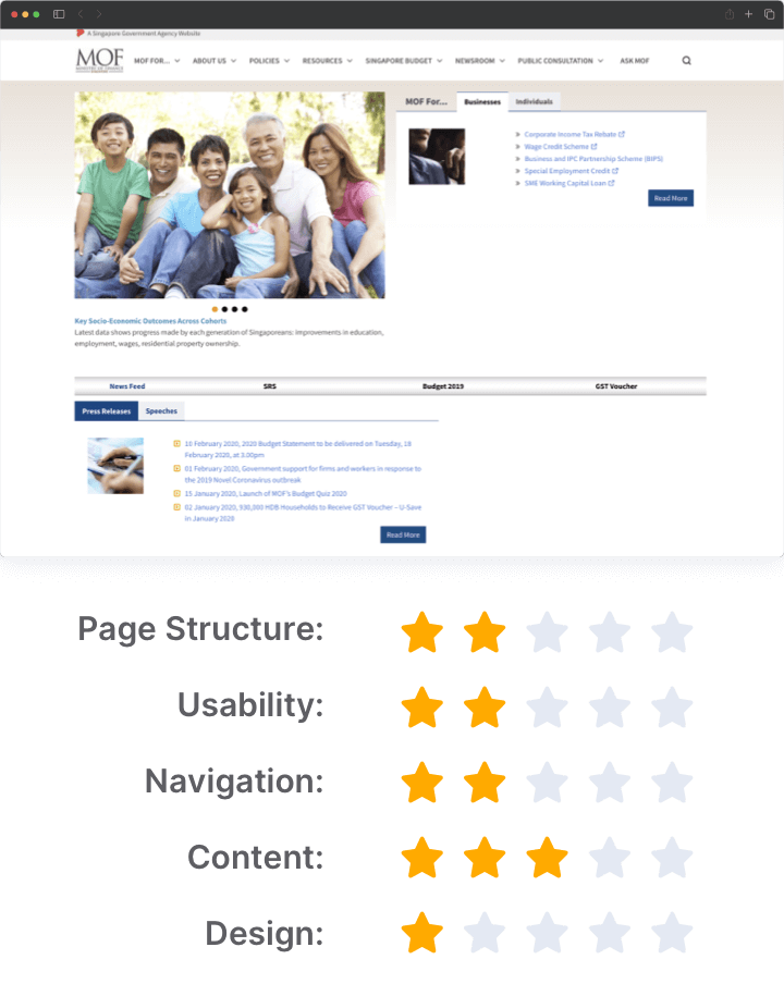 The MOF website is outdated and no longer reflect current design trends and best practices. It needs several improvements to enhance its usability and design.